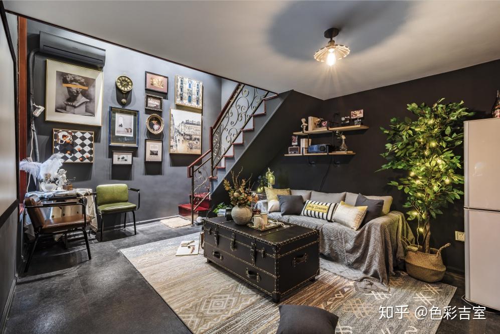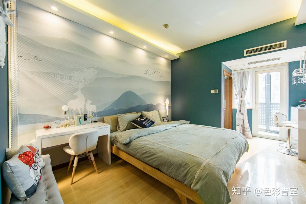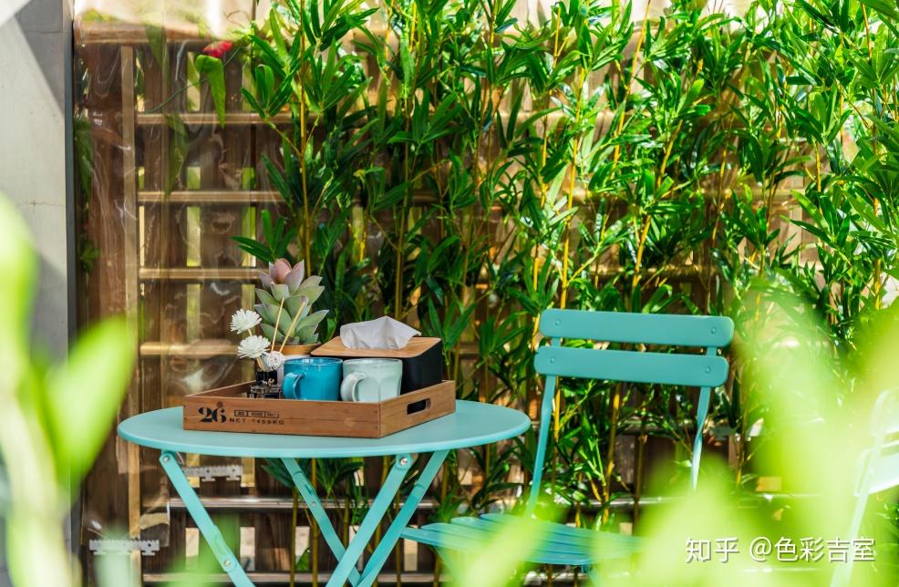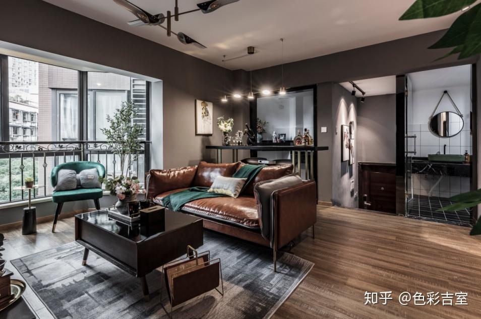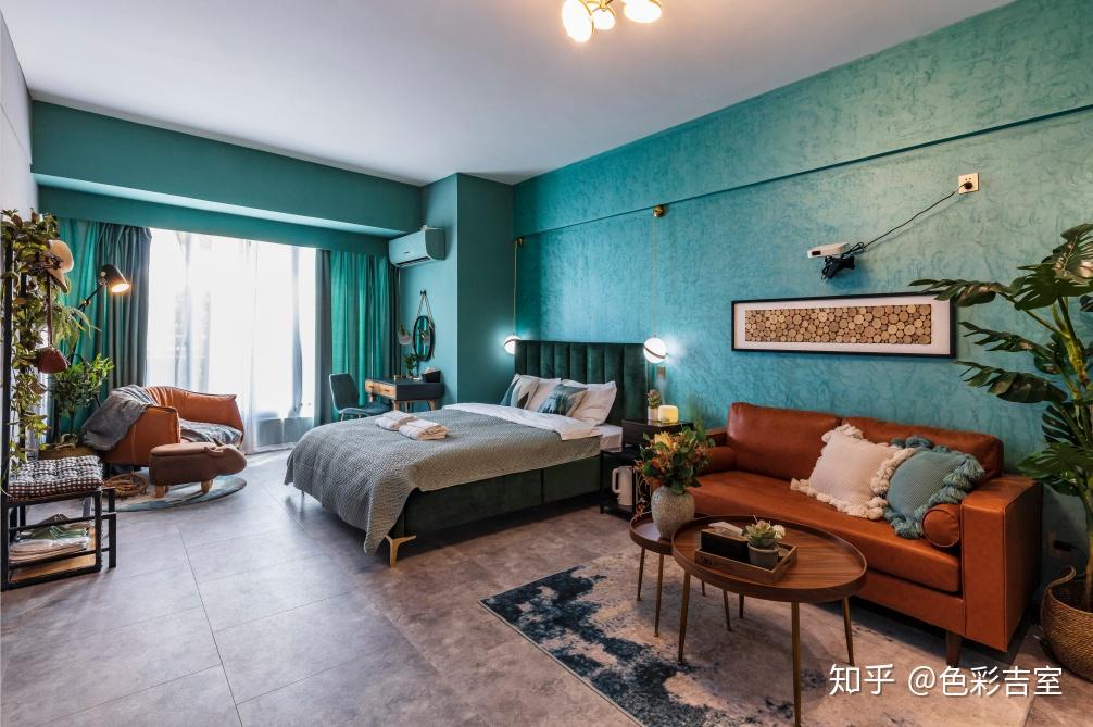 子青是墨绿色和皮革的颜色撞色,很森系的一套设计。位置极好,就在春熙路上,而且有一个超级大的阳台~