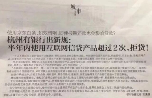 作者|周松涛 来源|首席财经观察(meirijingji001) “半年之内有过2次使用互联网借款记录的统统拒贷。” 银行发起狠来真的很吓人! 当前有很大部分人群已适应了超前消费,加之众多互利网借贷公司给足了便捷渠道,真的是动动手就能钱到手。不过,像房贷、车贷这样的大额贷款还需依赖银行,在过去,两者互不影响。 但现在,银行已经开始说“NO”了。 杭州银行首开拒贷先河 尽管有人曾担忧过,经常使用互联网借款弄不好以后银行会拒贷。但现实中并没有实例去佐证这种担忧。 不过,就在刚刚过去的4月份,杭州银行成为首家公开对网贷用户实行拒贷的银行,也让之前的担忧最终成为可怕的现实。 据了解,杭州银行已发布贷款新政,“只要近半年内有2次使用互联网借款的记录,如蚂蚁借呗、京东白条等,即使已经还清,也不予放贷。” 而有记者向该行某支行的个贷部经理求证,她表示,“确实有这个规定,上个月收到的通知,这个月开始实行。” 不要以为这只是吓唬人的“纸老虎”,从媒体报道的信息来看,确实已经有人因为使用过互联网借款而被杭州银行拒之门外。 一位想向杭州银行借车贷的涂女士发了一条朋友圈,“刚刚银行信贷员告诉我,蚂蚁借呗、京东白条、微粒贷等产品,只要在近半年内有2次使用记录,不管还不还都不给我批车贷。” 想必这位涂女士也因此没拿到车贷。 关于杭州银行对网贷用户拒贷的消息也曾登上报纸媒体。 处处证实,对经常使用网络借款的用户拒绝贷款,银行这次时要来真的了! 要当心的不止是借呗和白条 倚仗电商平台的优势,蚂蚁金服旗下的借呗和京东旗下的京东白条显然已成为当下使用人群最广泛的互联网借款方式。 去年7月,京东金融消费金融事业部总经理区力曾在公开场合表示,白条上线三年来授信用户已达1.2亿。而借呗由于门槛限制和监管政策影响,时而开放时而关闭,用户数并不稳定,但有支付宝这款国民APP作为渠道入口,用户数量肯定不会低。 如果银行对这些用户统统实行拒贷,那波及范围可就非同小可。但即便如此,借呗和白条也只是万千互联网借款公司其中的一部分。 实际上我们应该担心的是所有会把借款记录上传至央行征信报告的互联网借款渠道,而不止是借呗和白条。 银行在贷款给客户时会审查申请人征信情况,而还没有上征信的借款记录银行其实并不会知晓,也不会去费力追究。 比如,使用花呗就不会影响在银行的贷款,因为花呗并没有(或者说暂时没有)跟央行的征信对接。而借呗就不同,借呗在去年就已经全面对接央行征信。 同样的,京东白条的普通白条也暂时没有对接央行征信,而大白条(区别于普通白条只能在京东商城购物,大白条是用于旅游、装潢、教育等领域的消费贷款消性质)已经对接征信。 不过,今年3月,京东金融宣布,普通金条也已启动征信接入工作。 跟很多人理解的只有出现还款逾期才会在征信报告上添一笔不同,据某个已经接入央行征信的互联网借贷平台的表现来看,即便是买一瓶水也要上征信。 这样即便是没有出现逾期,但征信报告上却写满了小额个人消费贷款记录。这样的征信报告搁谁眼里都是非常的难看,将会大大降低贷款申请人的可信度。 所以,当征信时代来临,每一笔借款都得小心对待。 银行都在重视网贷征信 除了杭州银行外,大多数银行没有如杭州银行这样明确规定,但有类似“潜规则”。 据中国农业银行一位信贷员告诉《IT时报》记者,“我们银行没有硬性规定,但如果在京东白条、蚂蚁借呗等平台借过钱,必须结清才能申请贷款,要不然很难申请下来。” 而招商银行的一位信贷员则表示,招行在审批贷款时,会看申请人的具体征信、负债情况,如果在互联网借贷平台上借过钱,的确会比没有在互联网借贷平台上借过的人难批。 对于银行来讲,互联网借贷风险较大,把互联网借贷情况作为贷款审批要素之一,一定程度上可以降低贷款风险。这也是风控的要求。 但在很多用户看来,银行审核资质时应该看是否逾期等还款能力,而不是粗暴的只看有无借款记录。 尽管银行的做法的确有失公平,不管是对用户还是对互联网借贷平台,但作为大额借款的主要来源,银行也有强势的底气,除非你真的不想在银行那里贷任何款了。 随着信联等机构的成立以及越来越多的互联网贷款平台主动接入央行征信,每个人的借贷情况都已无处遁形,而现在银行越来越重视贷款申请人的网贷征信情况,也能轻易拿到所有人的贷款的记录,这势必给那些经常使用网贷的人群很大的不利。 善待自己的征信吧,别到时候真的被银行拒贷就后悔晚矣! 好文推荐 1.疯狂“抢钱”,银行揽存竞争白热化,重磅货币政策将来临! 2.快自查!你的身份证可能正在被使用,太多人已中招 3.别了,北上广深!刚刚,最新城市排名出炉,这些城市名次出现巨变 4.一跌再跌!曾搞垮国产品牌的美国巨头现在却败退中国! 版权问题、商务合作请加QQ/微信2881339636